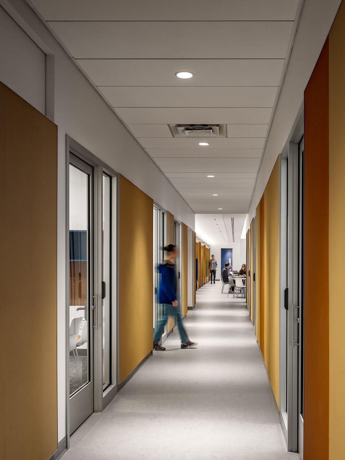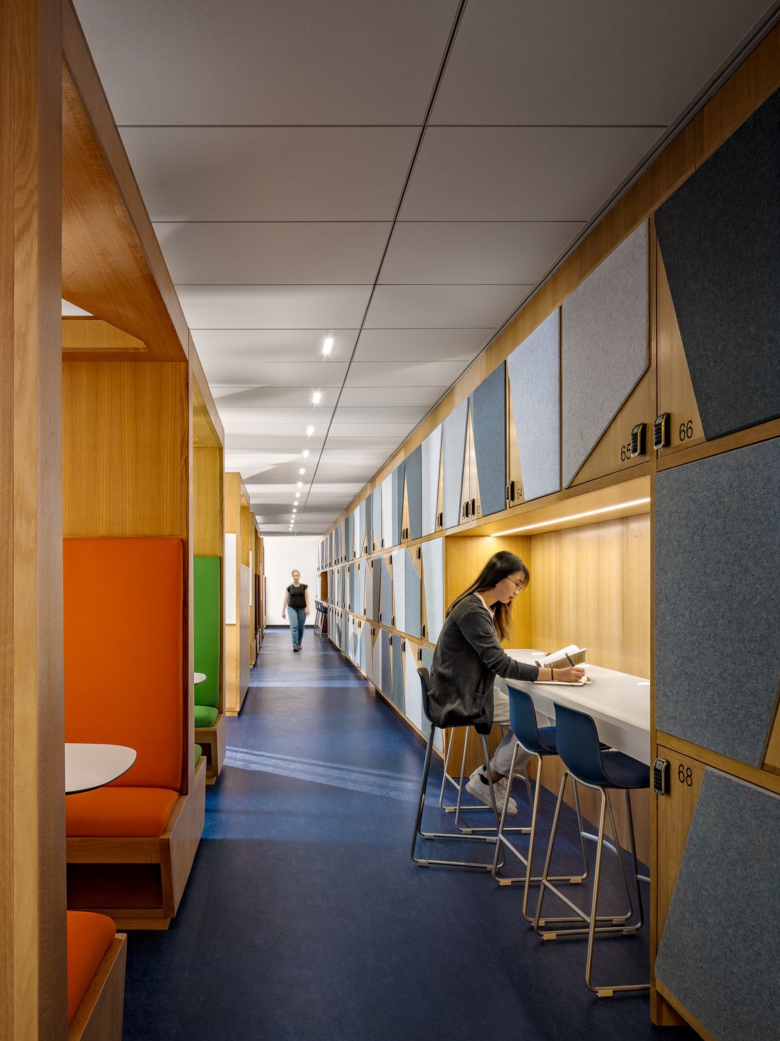 The design also features a multipurpose room with movable partitions to provide programmatic flexibility, administrative offices, specialized club rooms, and a campus store. Its bold and welcoming color and material palette creates a consistent, comfortable atmosphere throughout the full suite.