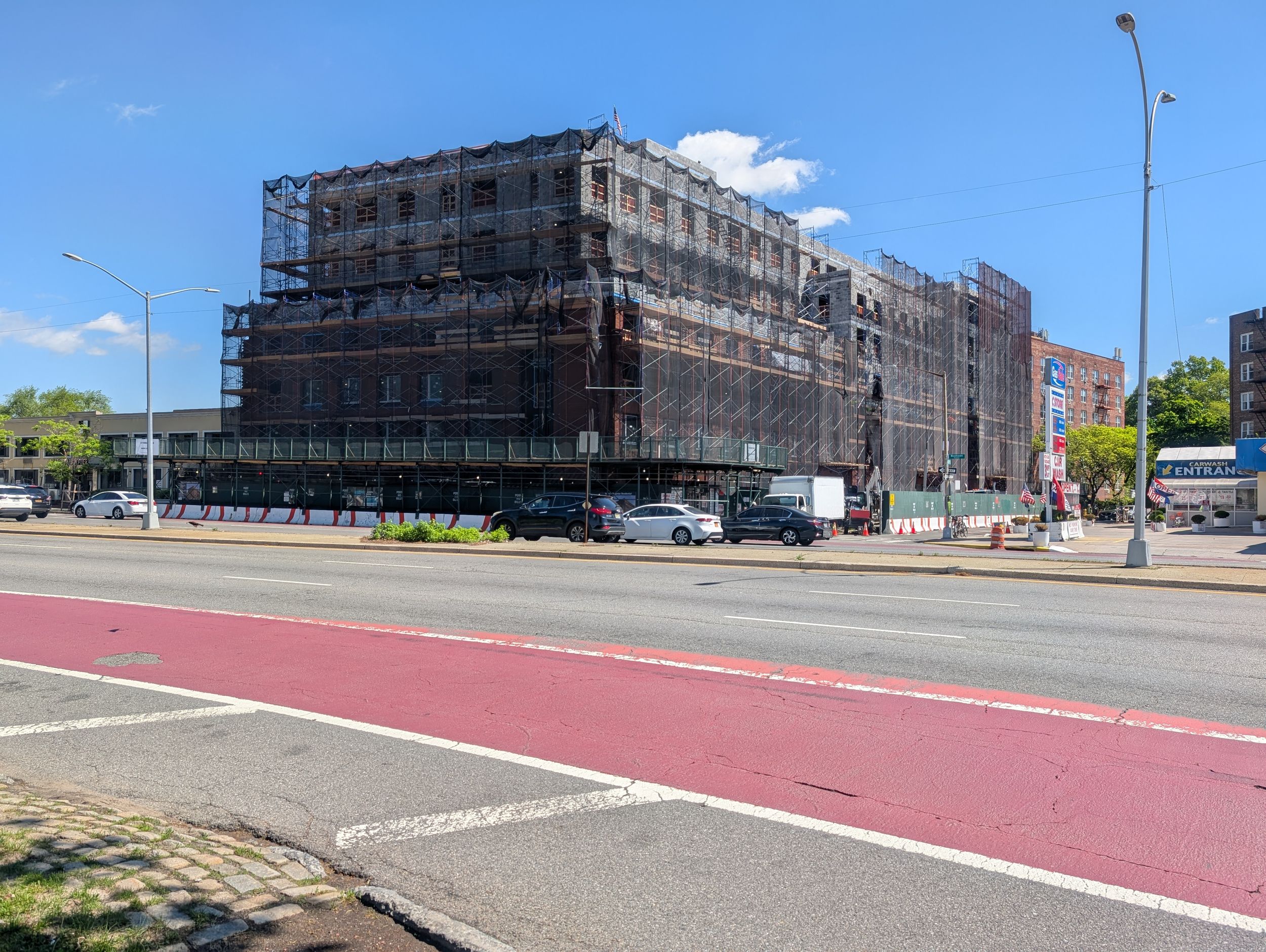 The Woodhaven stitches together the diverse architecture of Rego Park, from single-family homes along the north edge of the site to the low-rise commercial buildings on Woodhaven Boulevard and 6-story masonry residential buildings along Alderton Street. The L-shaped site offers a unique opportunity amid this wide range of building typologies to bridge the gap between a car-centric roadway and the surrounding neighborhood with much needed density. The building’s volumes form a gentle spiral of setbacks along its two street facades; as construction continues, we’re looking forward to seeing how its brickwork will accentuate its massing with textured brick insets and other masonry details.