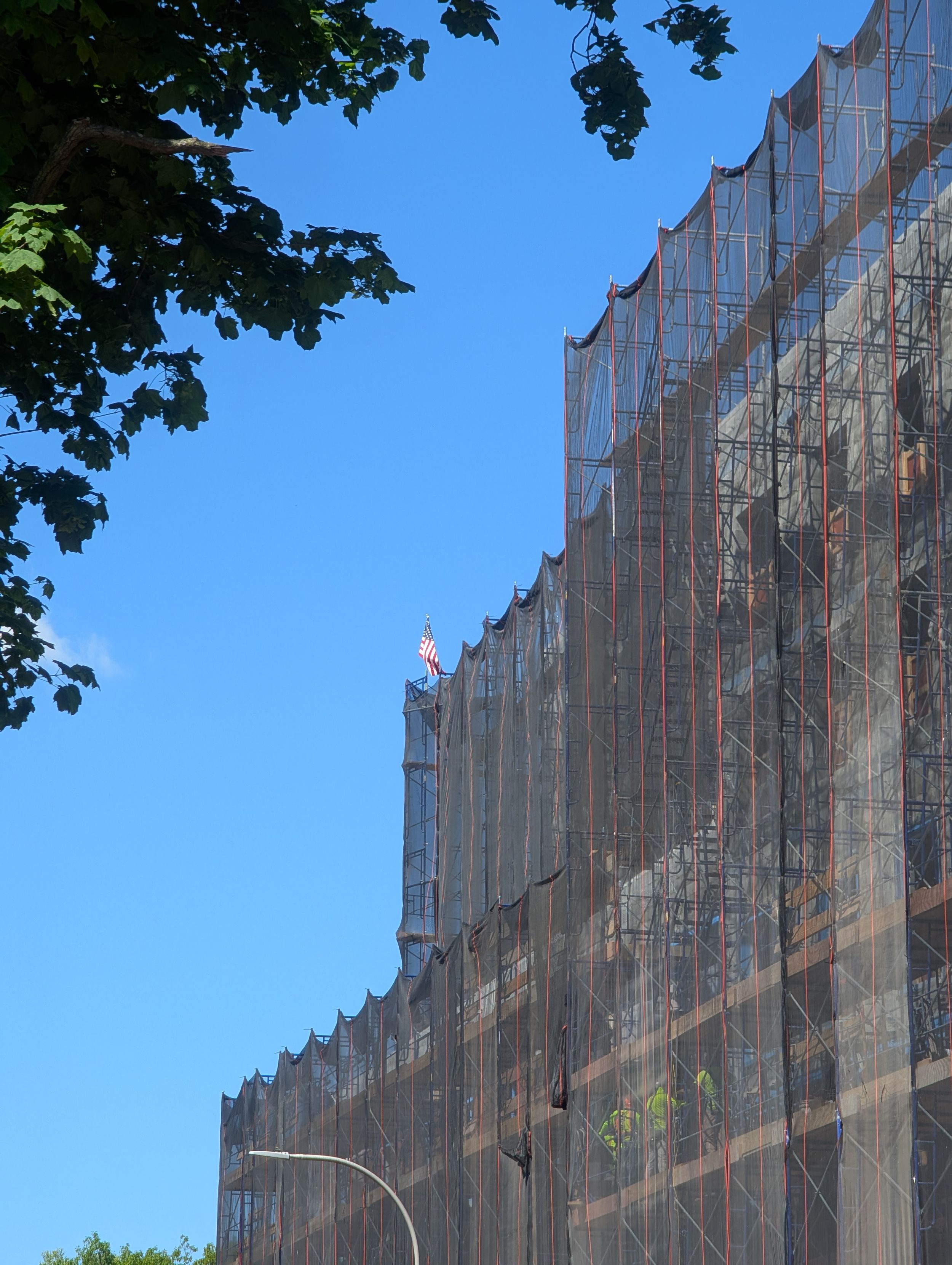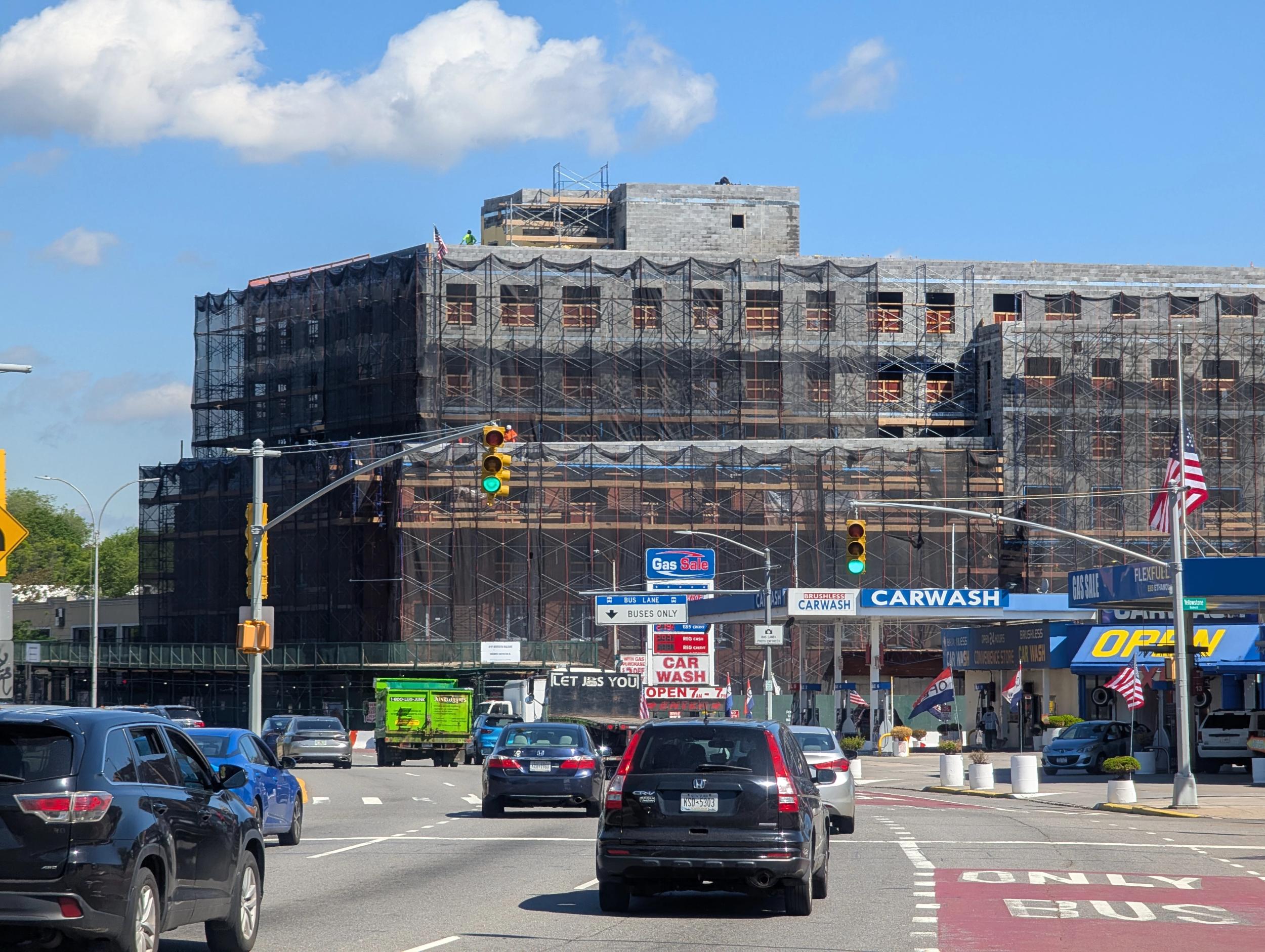 The Woodhaven stitches together the diverse architecture of Rego Park, from single-family homes along the north edge of the site to the low-rise commercial buildings on Woodhaven Boulevard and 6-story masonry residential buildings along Alderton Street. The L-shaped site offers a unique opportunity amid this wide range of building typologies to bridge the gap between a car-centric roadway and the surrounding neighborhood with much needed density. The building’s volumes form a gentle spiral of setbacks along its two street facades; as construction continues, we’re looking forward to seeing how its brickwork will accentuate its massing with textured brick insets and other masonry details.